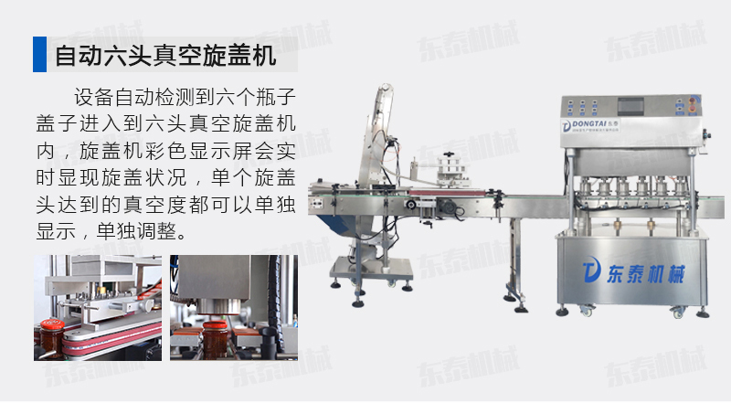 該直線式真空旋蓋機(jī)是東泰機(jī)械結(jié)合用戶使用的情況,摒棄了傳統(tǒng)轉(zhuǎn)盤式真空旋蓋機(jī)的弊端,研制開發(fā)的設(shè)備,設(shè)備自動(dòng)檢測到六個(gè)瓶子蓋子進(jìn)入到六頭真空旋蓋機(jī)內(nèi),旋蓋機(jī)彩色顯示屏?xí)䦟?shí)時(shí)顯現(xiàn)旋蓋狀況,整機(jī)多點(diǎn)檢測,當(dāng)進(jìn)口無瓶無蓋、出口堵塞、定位不準(zhǔn)、瓶身傾倒均自動(dòng)停機(jī)。單個(gè)旋蓋頭達(dá)到的真空度都可以單獨(dú)顯示,單獨(dú)調(diào)整!