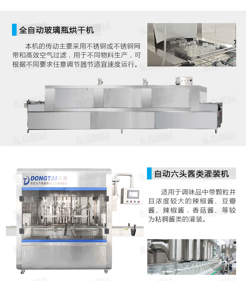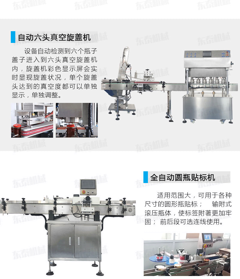 番茄醬灌裝旋蓋生產(chǎn)設(shè)備組成: 自動(dòng)供瓶機(jī)+全自動(dòng)滾筒洗瓶機(jī)+自動(dòng)六米烘干機(jī)+自動(dòng)收瓶機(jī)+全自動(dòng)六頭灌裝機(jī)自動(dòng)灌裝+全自動(dòng)提蓋機(jī)自動(dòng)理蓋、提蓋、掛蓋+六頭真空旋蓋機(jī)同時(shí)六個(gè)頭真空旋蓋+套標(biāo)機(jī)+收縮