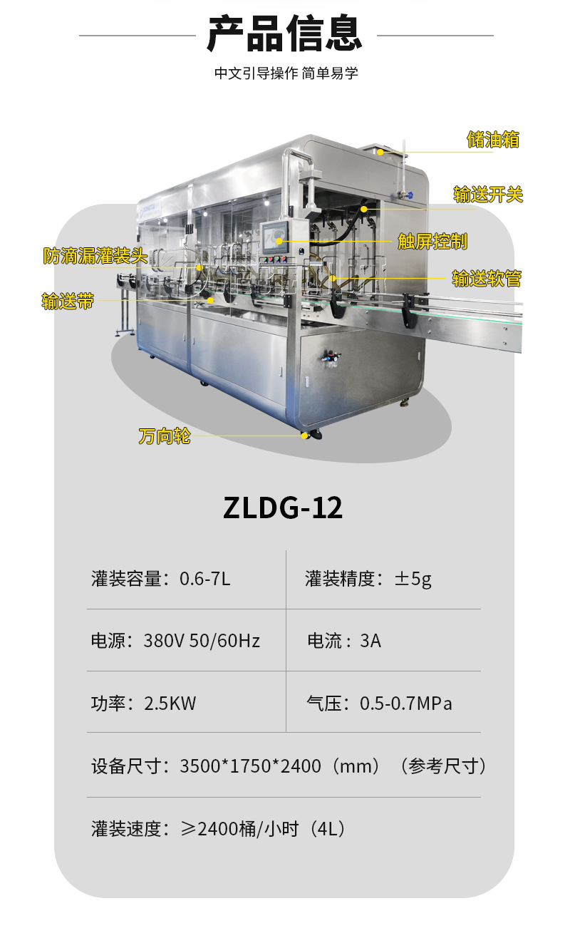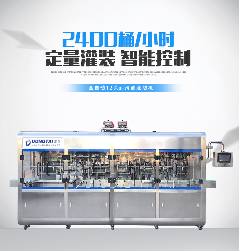 該灌裝機可以配置 高速旋蓋機 油桶貼標機 油瓶噴碼機 油壺自動自動裝箱碼垛機。組成油脂灌裝包裝流水線。節(jié)能、自動化的設備。