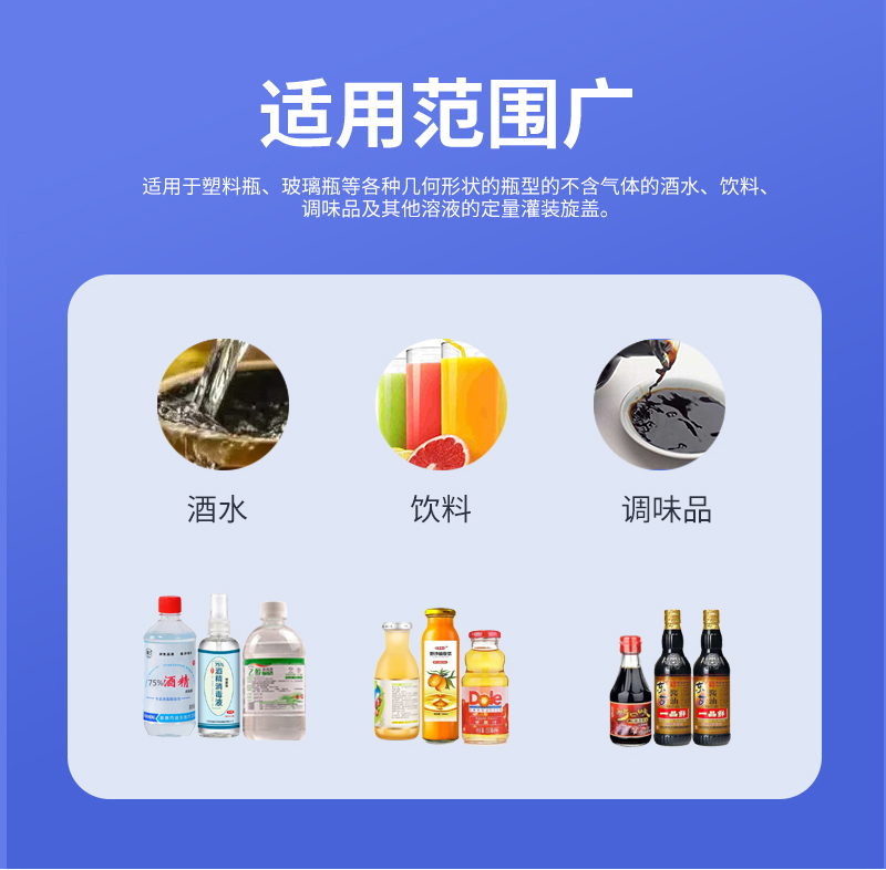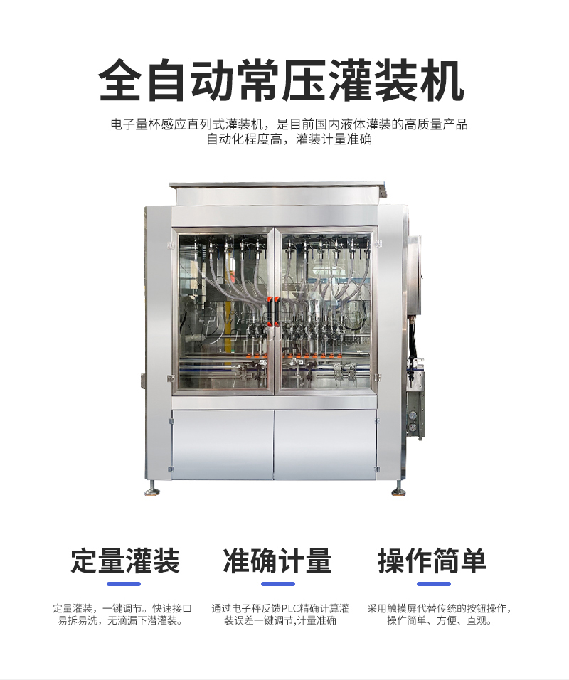 電子量杯感應直列式灌裝機,是目前國內液體灌裝的高端產品,自動化程度高,灌裝計量精確,適用于塑料瓶、玻璃瓶等各種幾何形狀的瓶型的不含氣體的酒水、飲料、調味品及其他溶液的定量灌裝。機器采用觸摸
