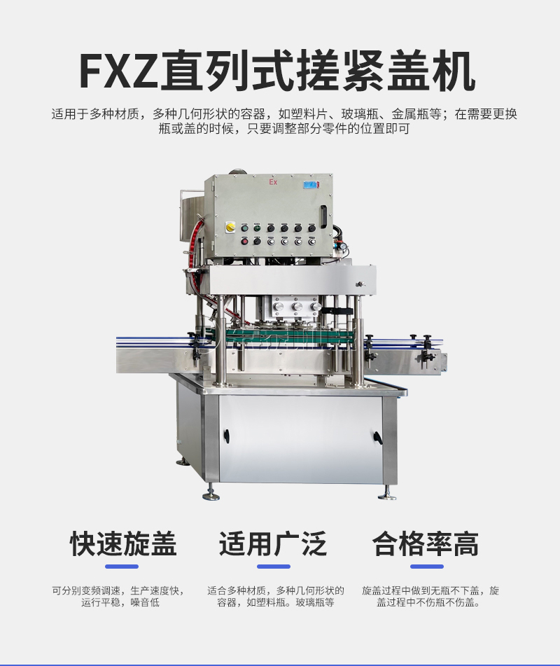 電子量杯感應直列式灌裝機,是目前國內液體灌裝的高端產品,自動化程度高,灌裝計量精確,適用于塑料瓶、玻璃瓶等各種幾何形狀的瓶型的不含氣體的酒水、飲料、調味品及其他溶液的定量灌裝。機器采用觸摸屏代替?zhèn)鹘y(tǒng)的按鈕操作,操作簡單、方便、直觀?萍己扛摺C器灌裝計量可通過觸摸屏對灌裝時間的調整實現(xiàn)不同計量灌裝,方便操作者使用。