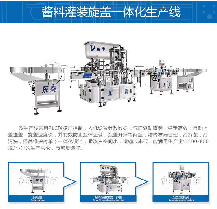 自動化醬料灌裝機是專業(yè)根據辣椒醬、豆瓣醬、牛肉醬、芝麻醬、香菇醬、蝦醬等醬類所研發(fā)設計的,市場上這么多的商品都是要經過包裝之后才能流通的,因此自動化醬料灌裝機成為了現代化社會生產的新技術,其經過我們東泰多年的科技成果不斷改進適用廣泛,在自動化方面等等更是十分的人性化,當前可以從各行業(yè)的產品生產來看都是可以選擇自動化醬料灌裝機來進行包裝的,該機依靠著我們東泰專業(yè)的技能占據著整個行業(yè)的重位,從而更好的滿足人們的消費觀念
