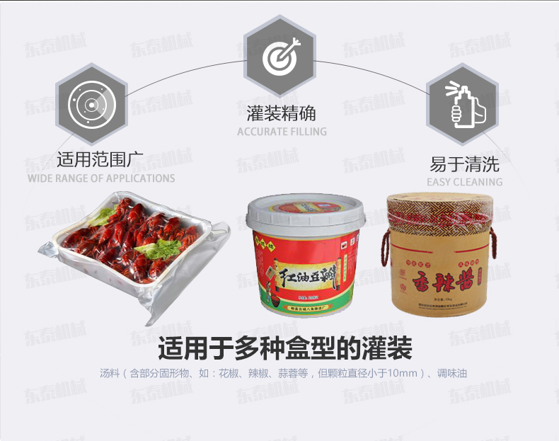 紅油辣椒醬自動灌裝機介紹: 紅油辣椒醬自動灌裝機針對于調(diào)味小龍蝦深加工行業(yè)的調(diào)味油、湯料的加注,整個系統(tǒng)為直線式傳送結(jié)構(gòu),湯料、調(diào)味油可在同一臺設(shè)備上實現(xiàn)準確定量,且湯料、調(diào)味油為獨立的