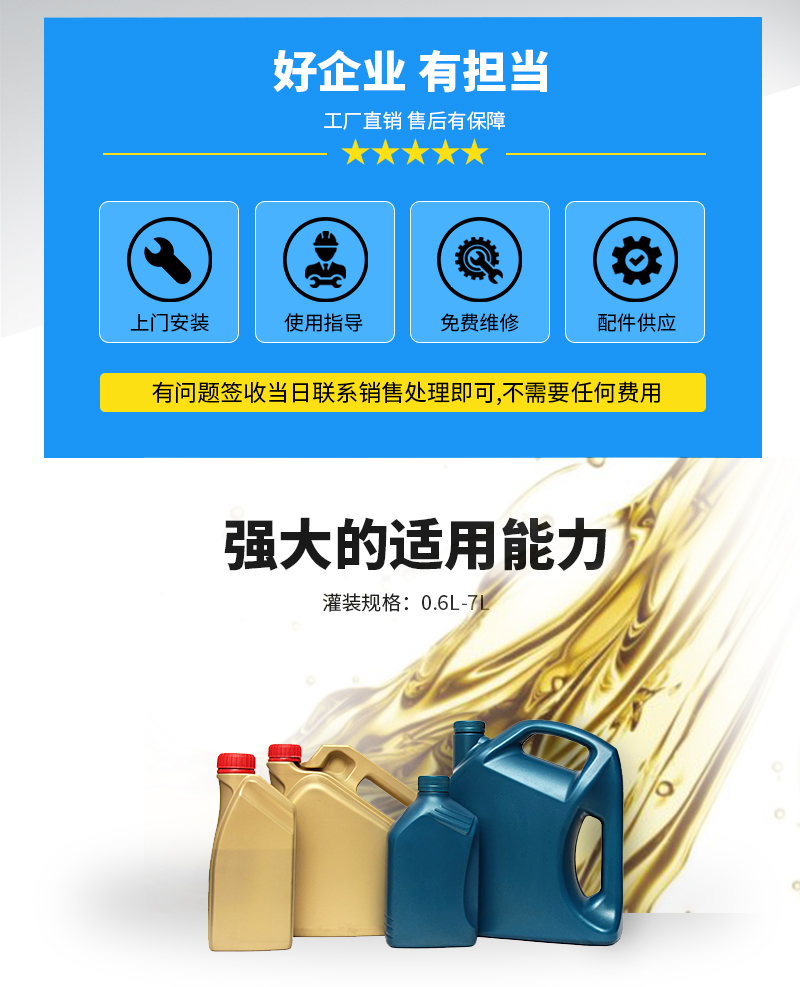 該灌裝機可以配置 高速旋蓋機 油桶貼標機 油瓶噴碼機 油壺自動自動裝箱碼垛機。組成油脂灌裝包裝流水線。節(jié)能、自動化的設備。