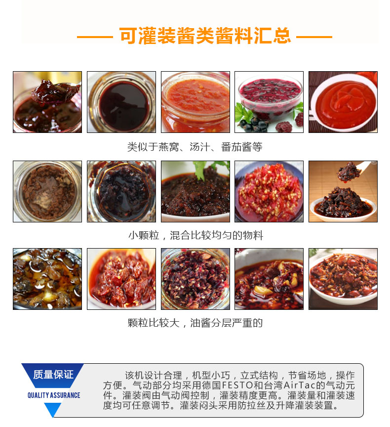 隨著機(jī)械技術(shù)的快速發(fā)展灌裝機(jī)的發(fā)展也是日新月異,使得其種類比較多。蘸醬在我國(guó)擁有悠久的歷史,在我國(guó)烹飪中占有著重要的地位,發(fā)展到現(xiàn)在在做菜和食品中也不可或缺,巨大的市場(chǎng)使得蘸醬灌裝機(jī)擁有巨大的市場(chǎng),醬類廠家在引進(jìn)設(shè)備時(shí)都想采購到高效率、適合自己的蘸醬灌裝機(jī)械。人們對(duì)食品要求的提高使得醬類生產(chǎn)廠家迎來了較大的變格,安全衛(wèi)生是非常重要的標(biāo)準(zhǔn),因此對(duì)蘸醬灌裝機(jī)的選擇也更加的要求嚴(yán)格,許多傳統(tǒng)的機(jī)械已經(jīng)不能滿足企業(yè)高標(biāo)準(zhǔn)、高效率的要求。因此選擇一款適合的蘸醬灌裝機(jī)械產(chǎn)品顯得尤為重要。